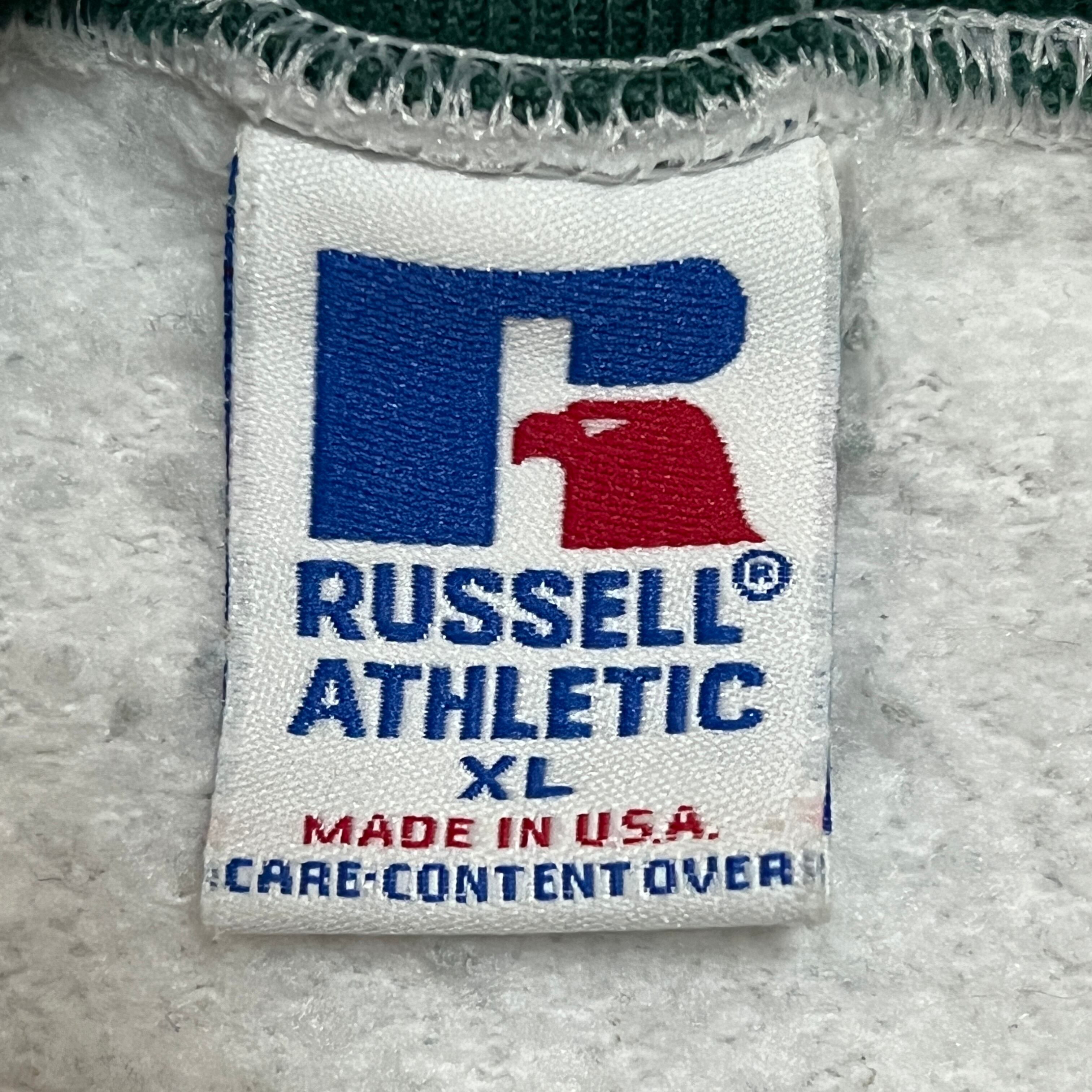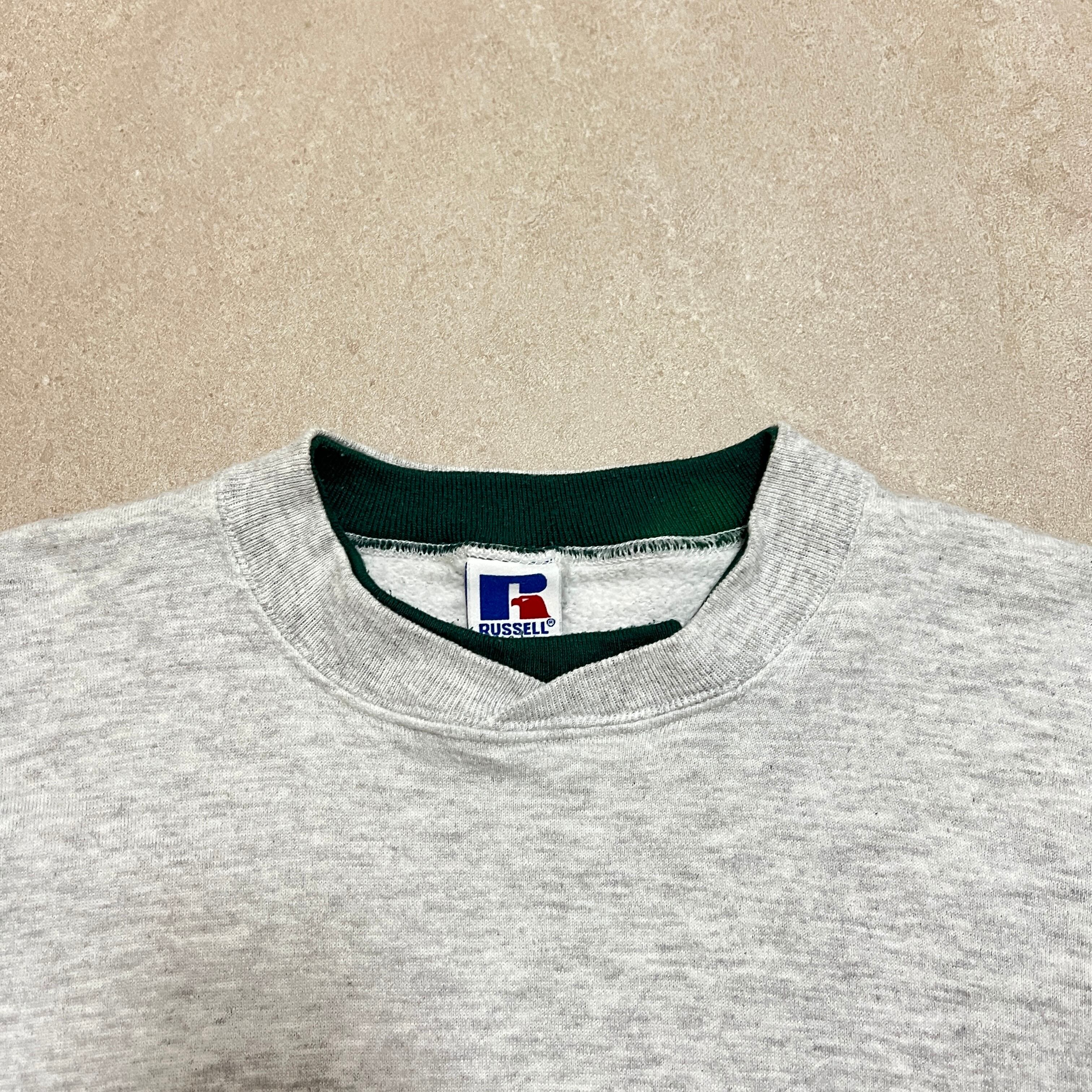 USA製 90s RUSSELL 無地スウェット 杢グレー系 袖グリーン系 サイズXL