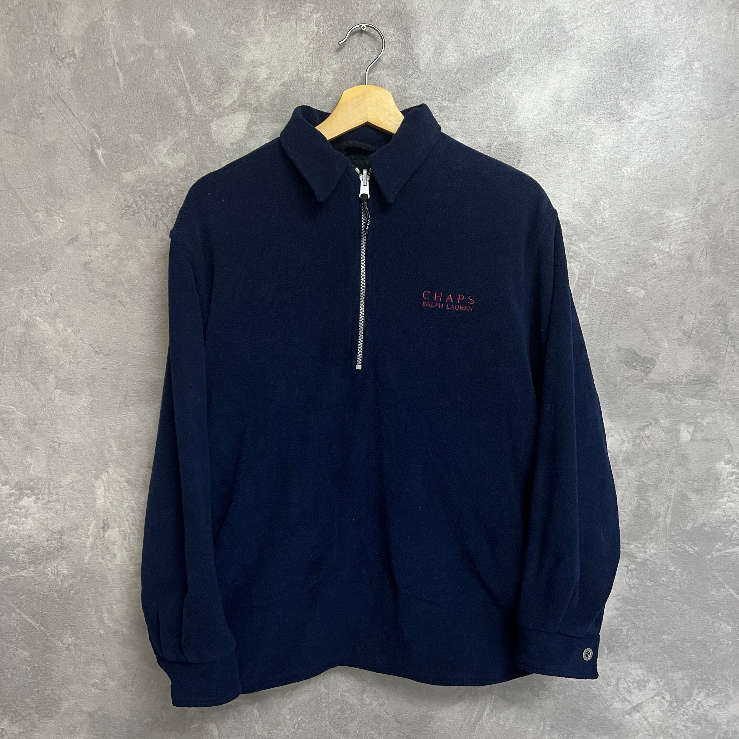 90s~00s CHAPS ハーフジップ フリースシャツ ネイビー ブラックウォッチ調チェック リバーシブル サイズM〜L相当 タグ欠損